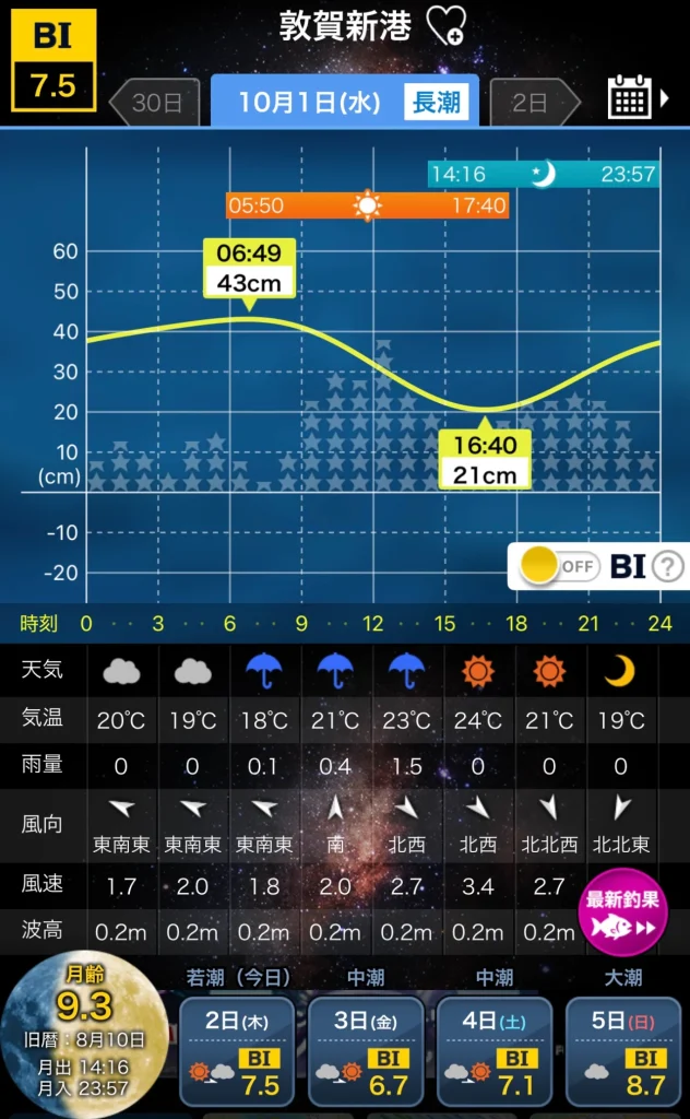 2025年9月30日-10月1日の気象データと釣行時間帯