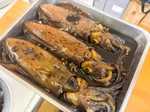 現地で釣りたてのイカを漬汁に浸して、(その時にイカが凄まじく荒ぶります)帰り着いてから汚れた漬け汁を捨てて新しいものに取り換え、更に一晩漬けたらできあがりです!